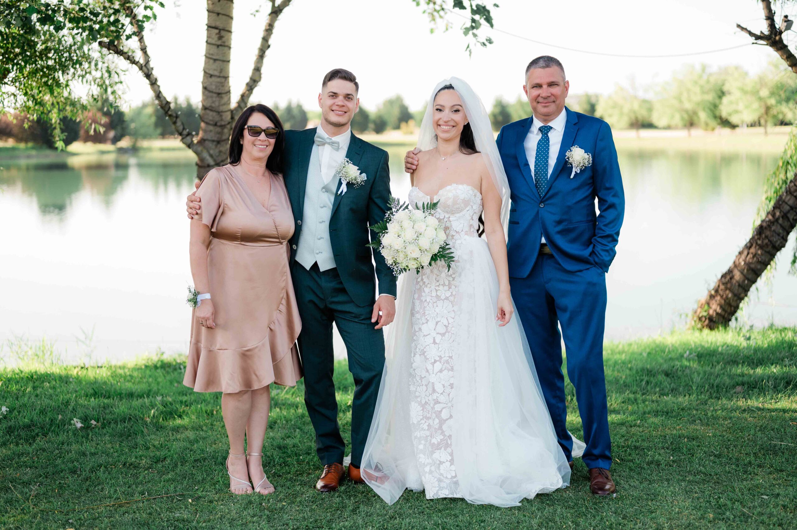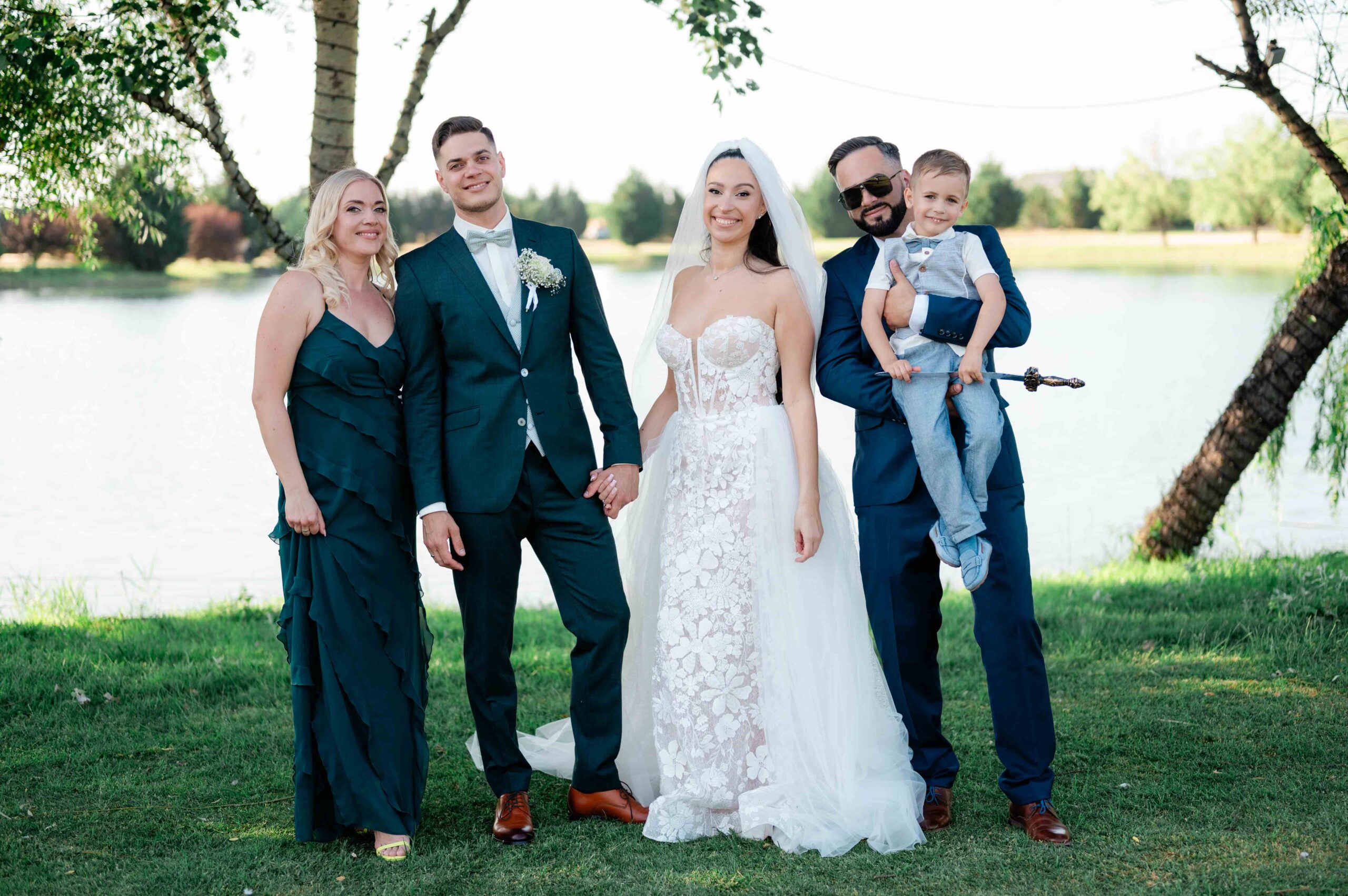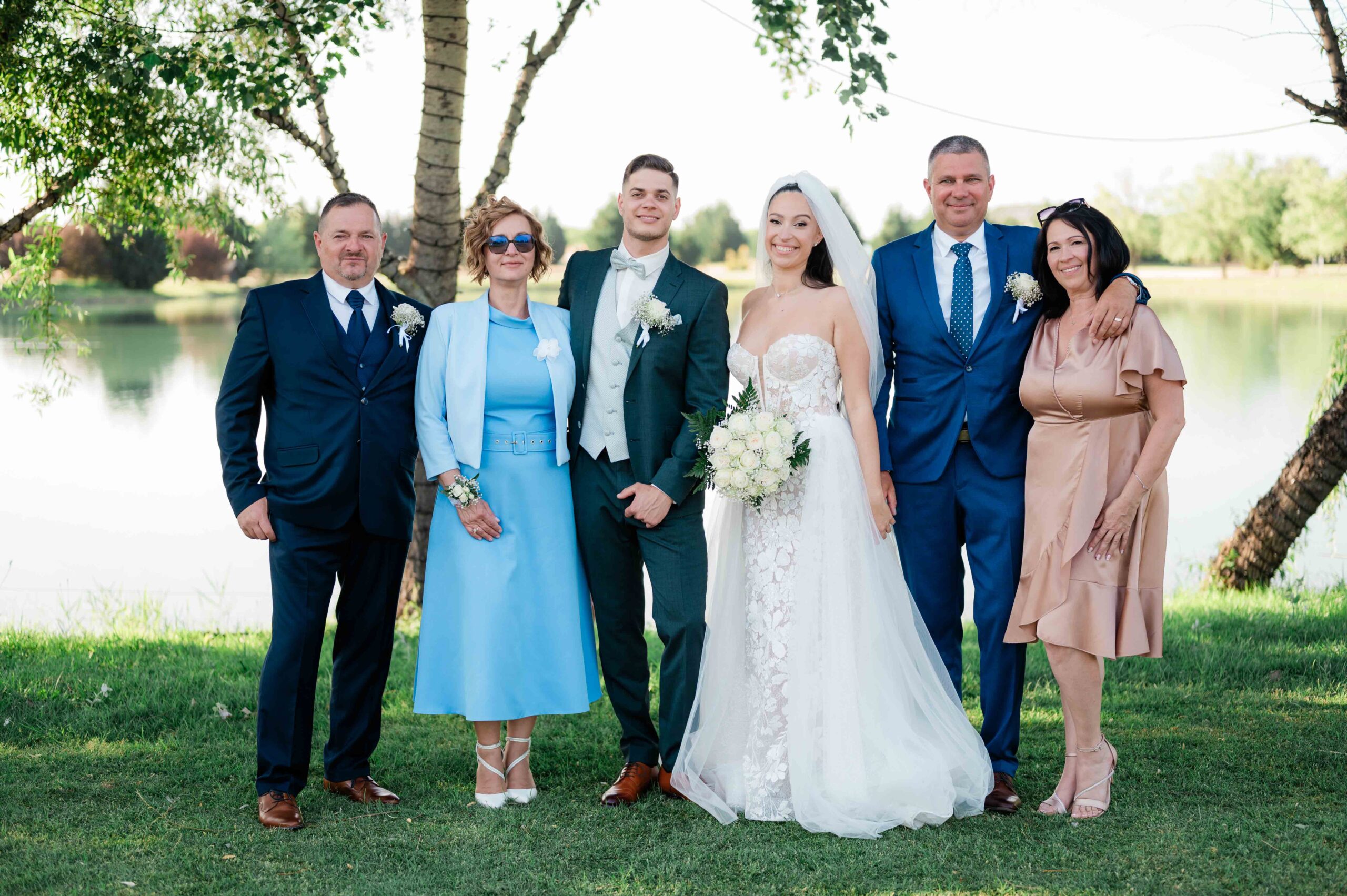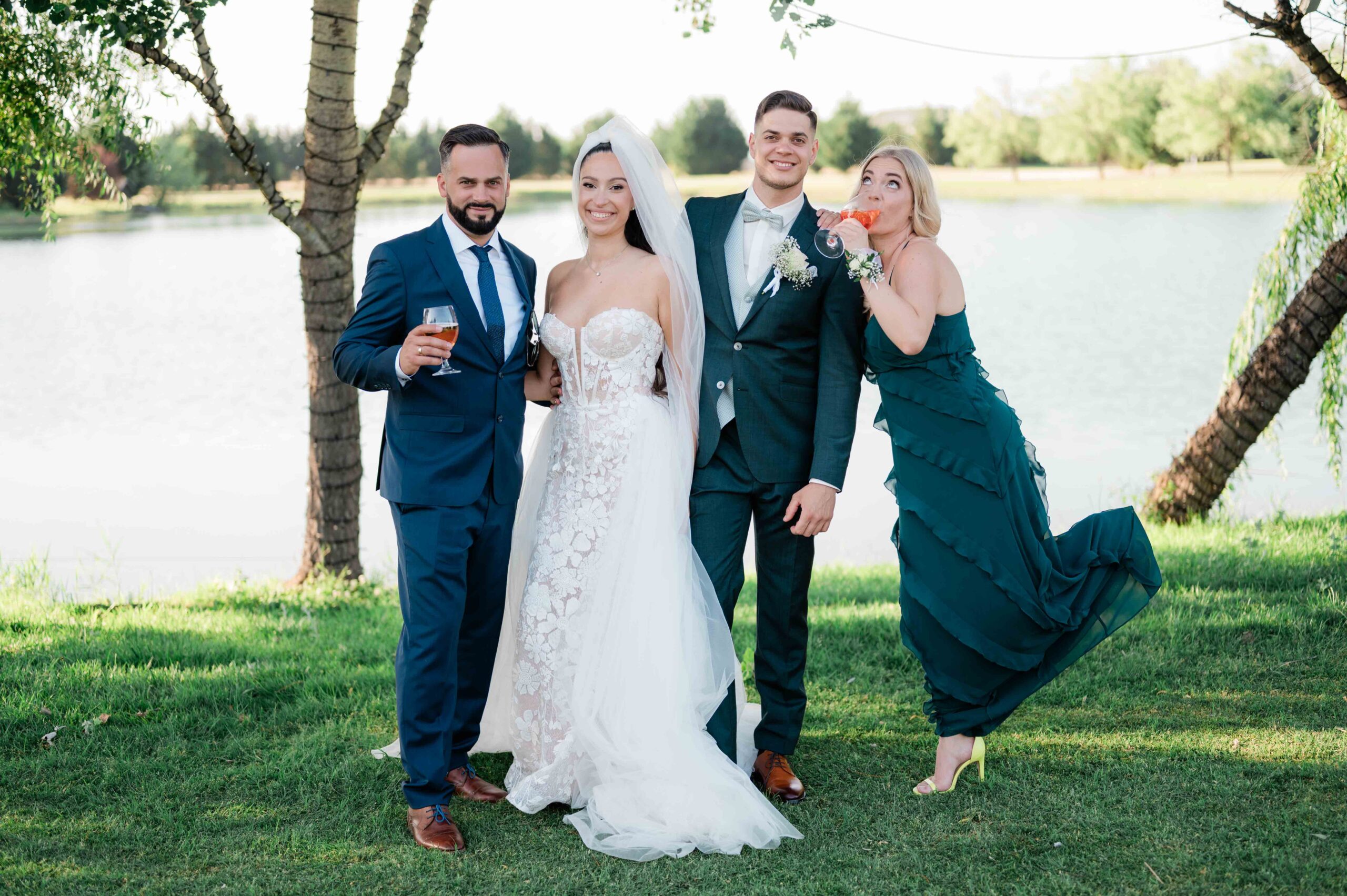 A kreatív portrék romantikus hangulatban készültek, a vízpart és a környező természet adta hátteret használva. Ezeken a képeken a pár visszafogottabb, csendesebb oldala is megjelent: egy-egy összebújás, lassabb mozdulat, nyugodtabb pillanat, ami jól ellenpontozta a nap pörgősebb részeit.