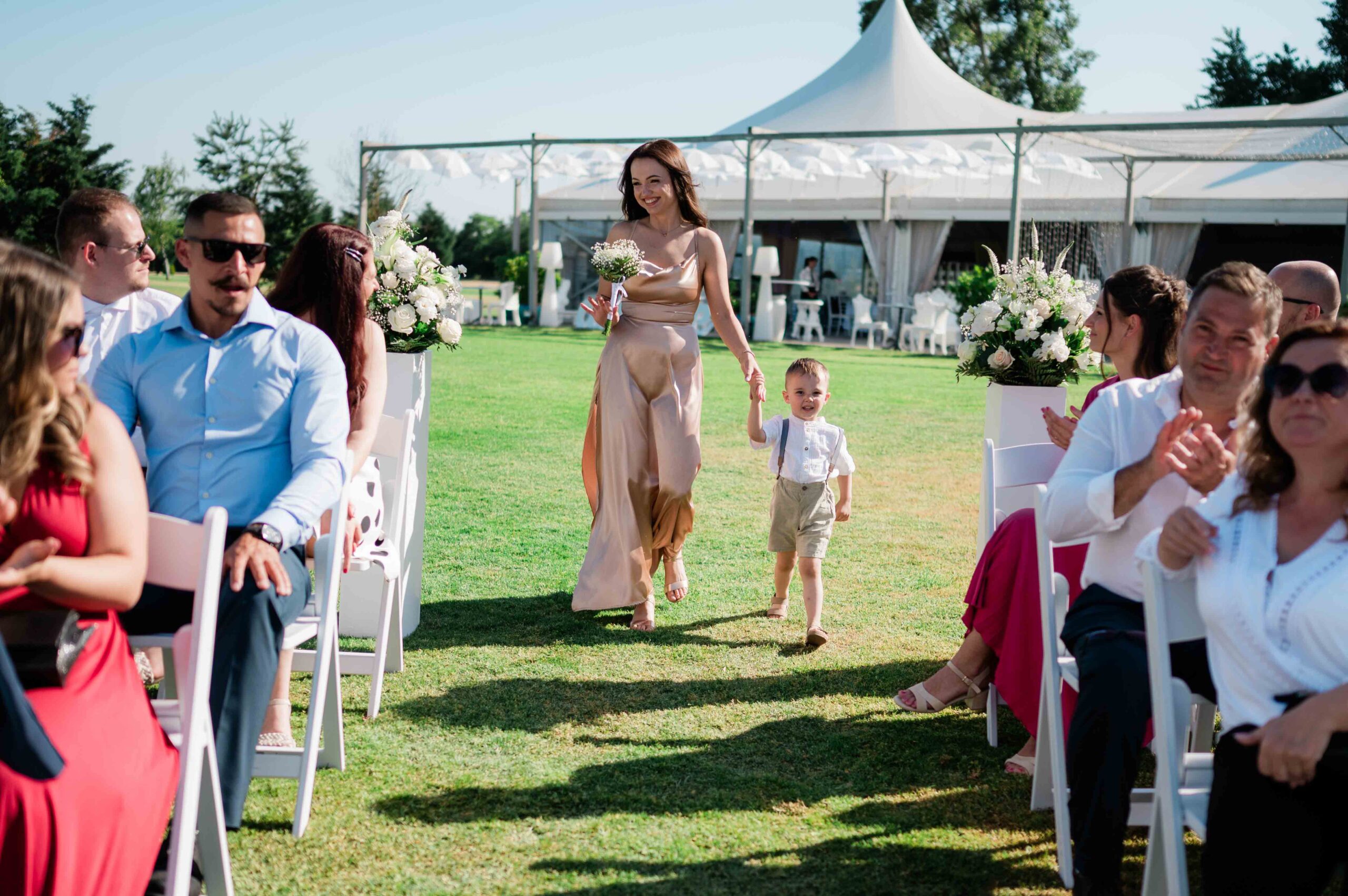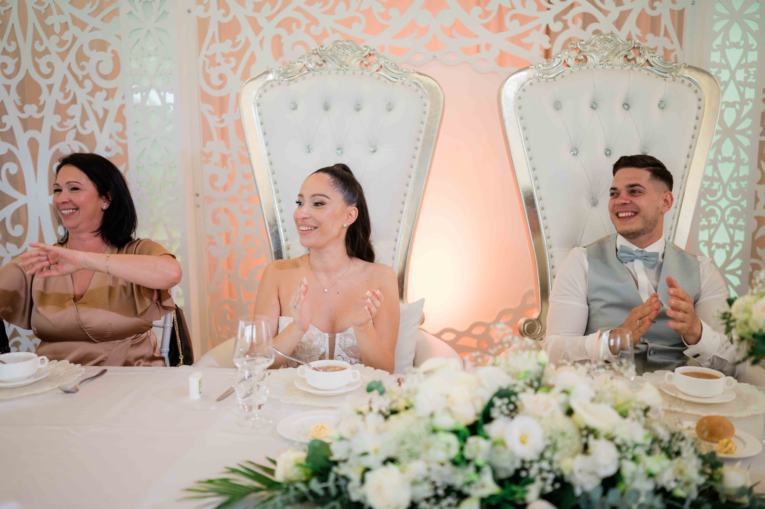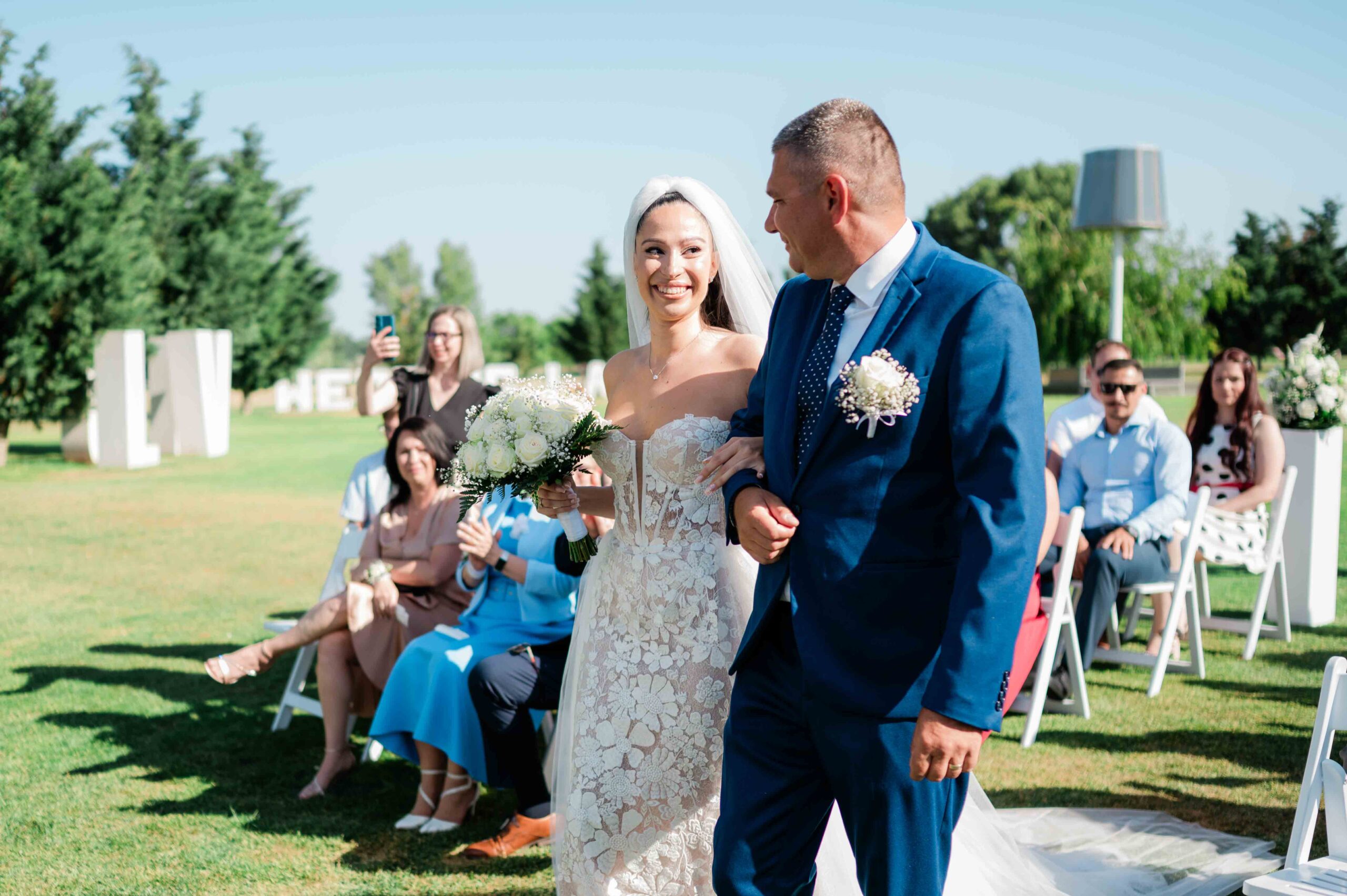 Gina és Szabi a ceremónia alatt sokat mosolyogtak, egymásra figyeltek, és láthatóan élvezték a pillanatokat. Az érzelmek könnyedén, természetesen jelentek meg, inkább nevetésekben és összenézésekben, mint csendes meghatódásban. Az egész szertartásnak volt egy fiatalos, laza lendülete.