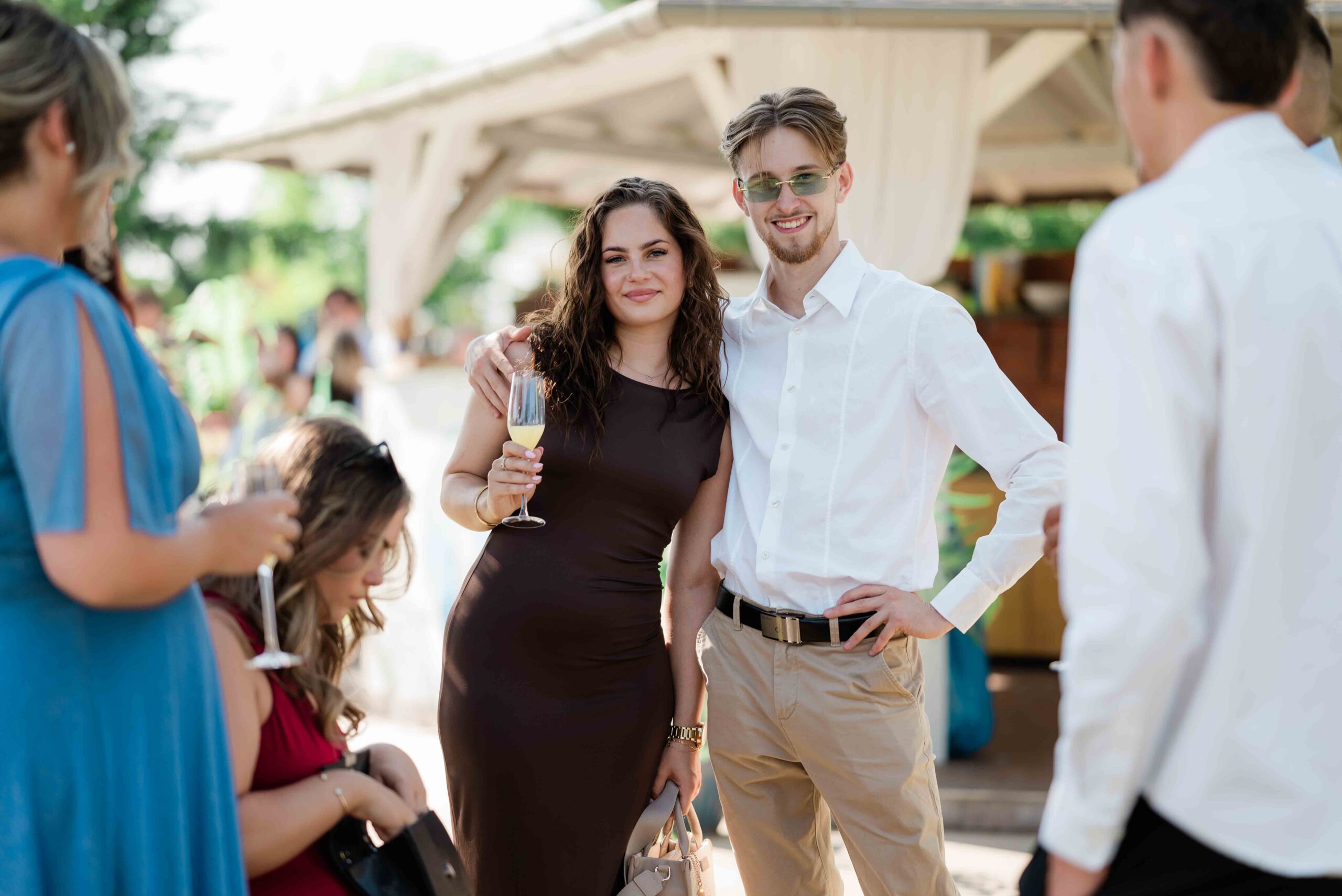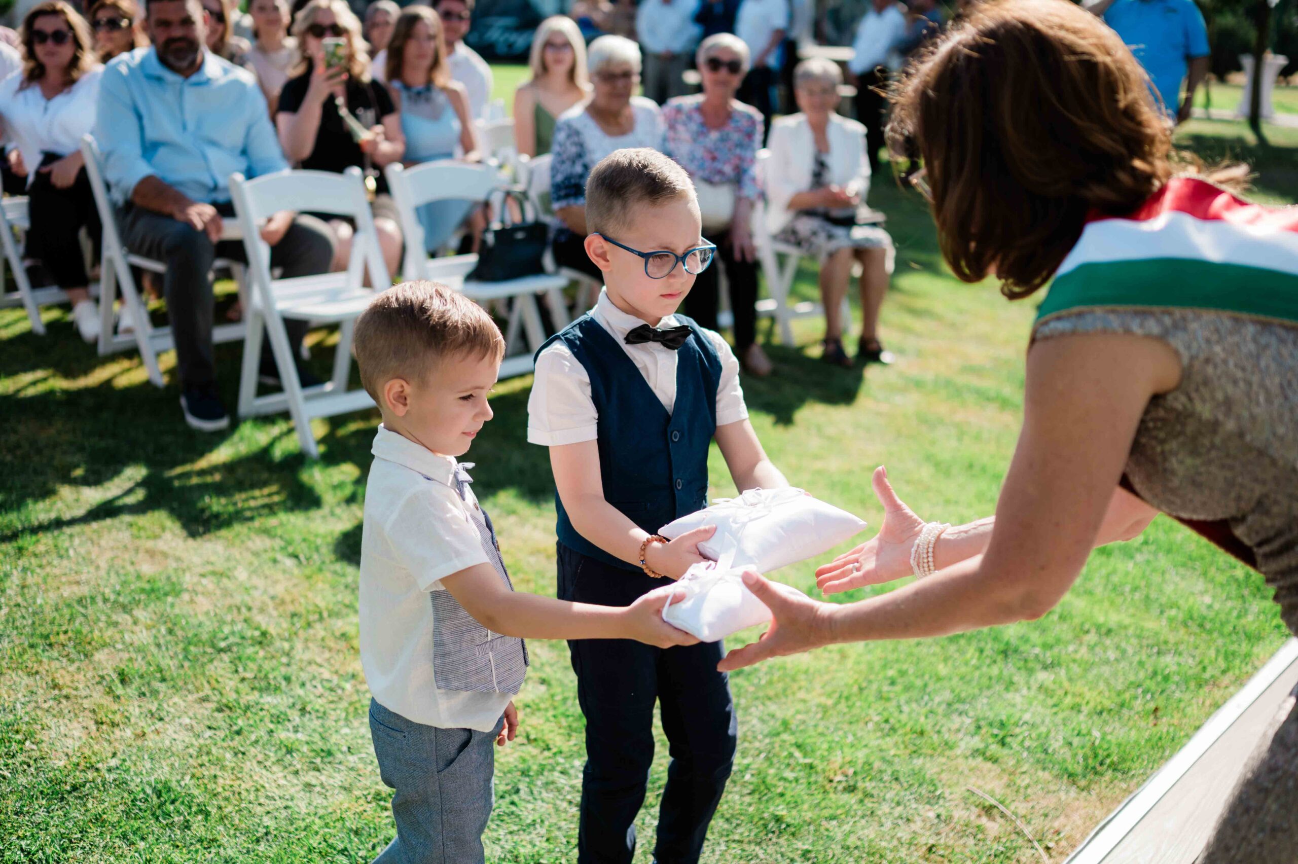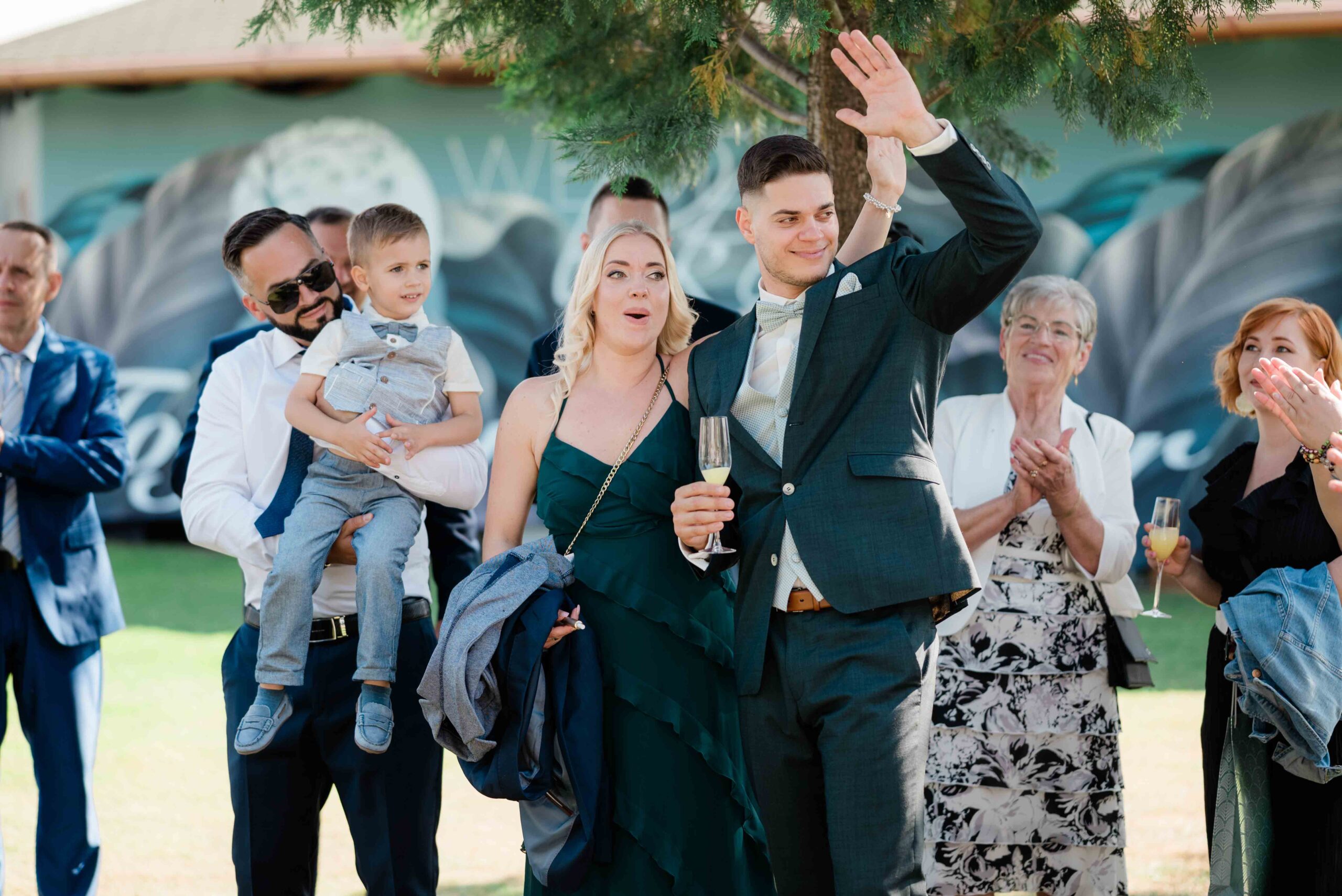Gina és Szabi a ceremónia alatt sokat mosolyogtak, egymásra figyeltek, és láthatóan élvezték a pillanatokat. Az érzelmek könnyedén, természetesen jelentek meg, inkább nevetésekben és összenézésekben, mint csendes meghatódásban. Az egész szertartásnak volt egy fiatalos, laza lendülete.