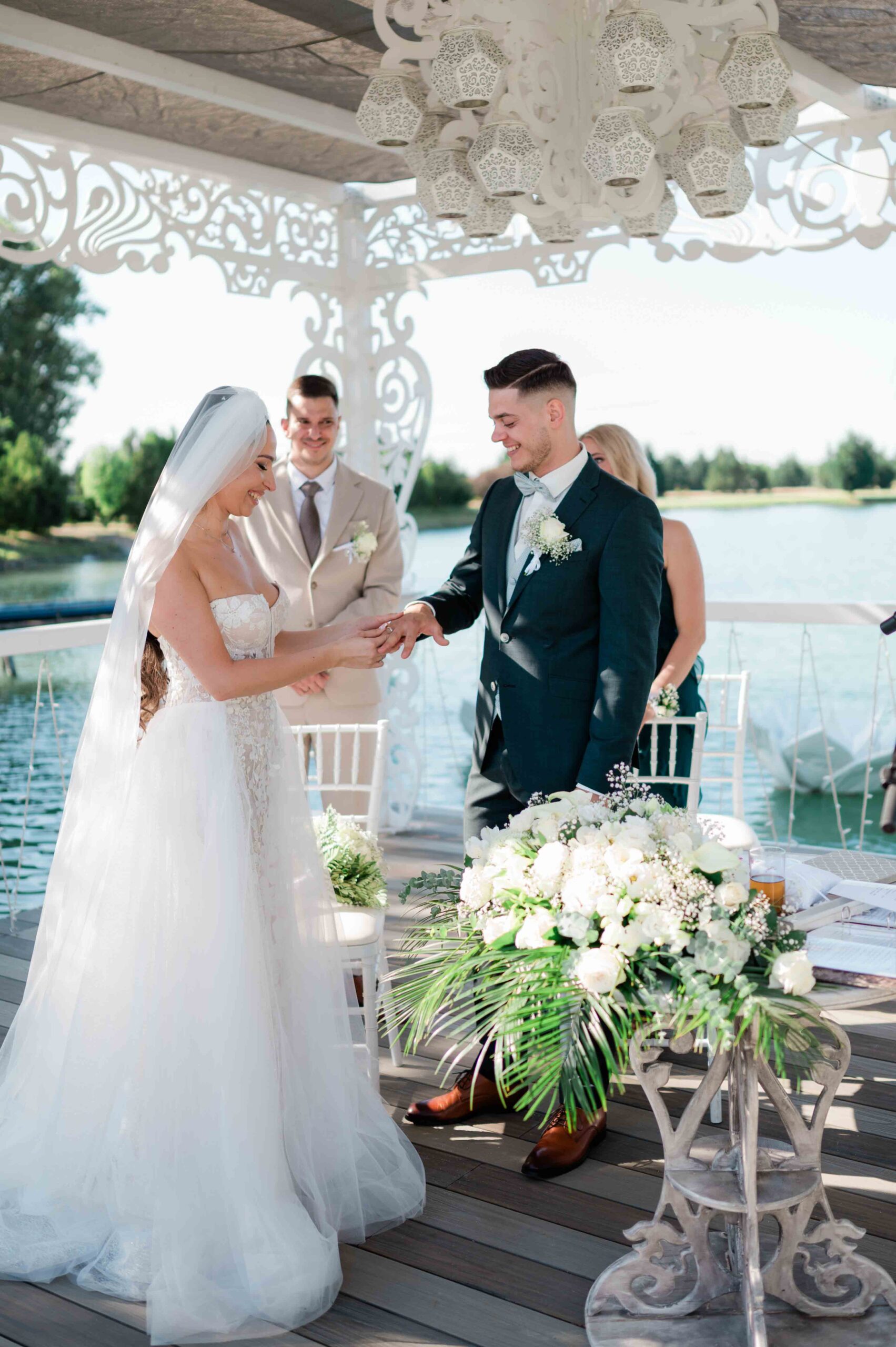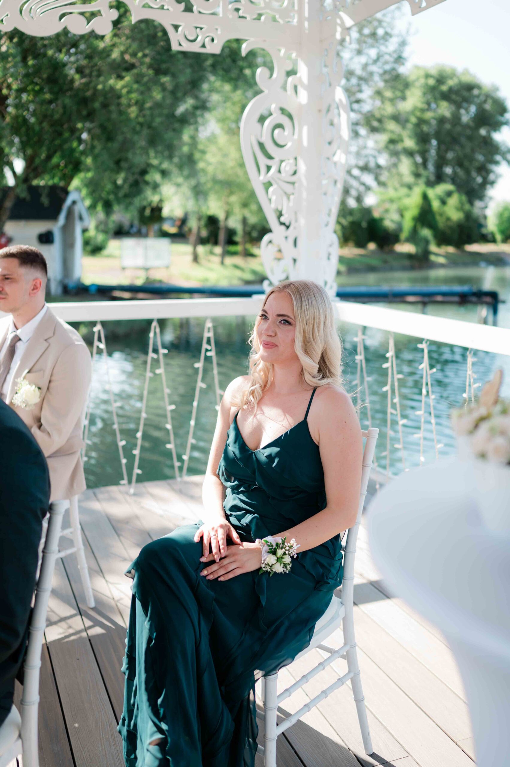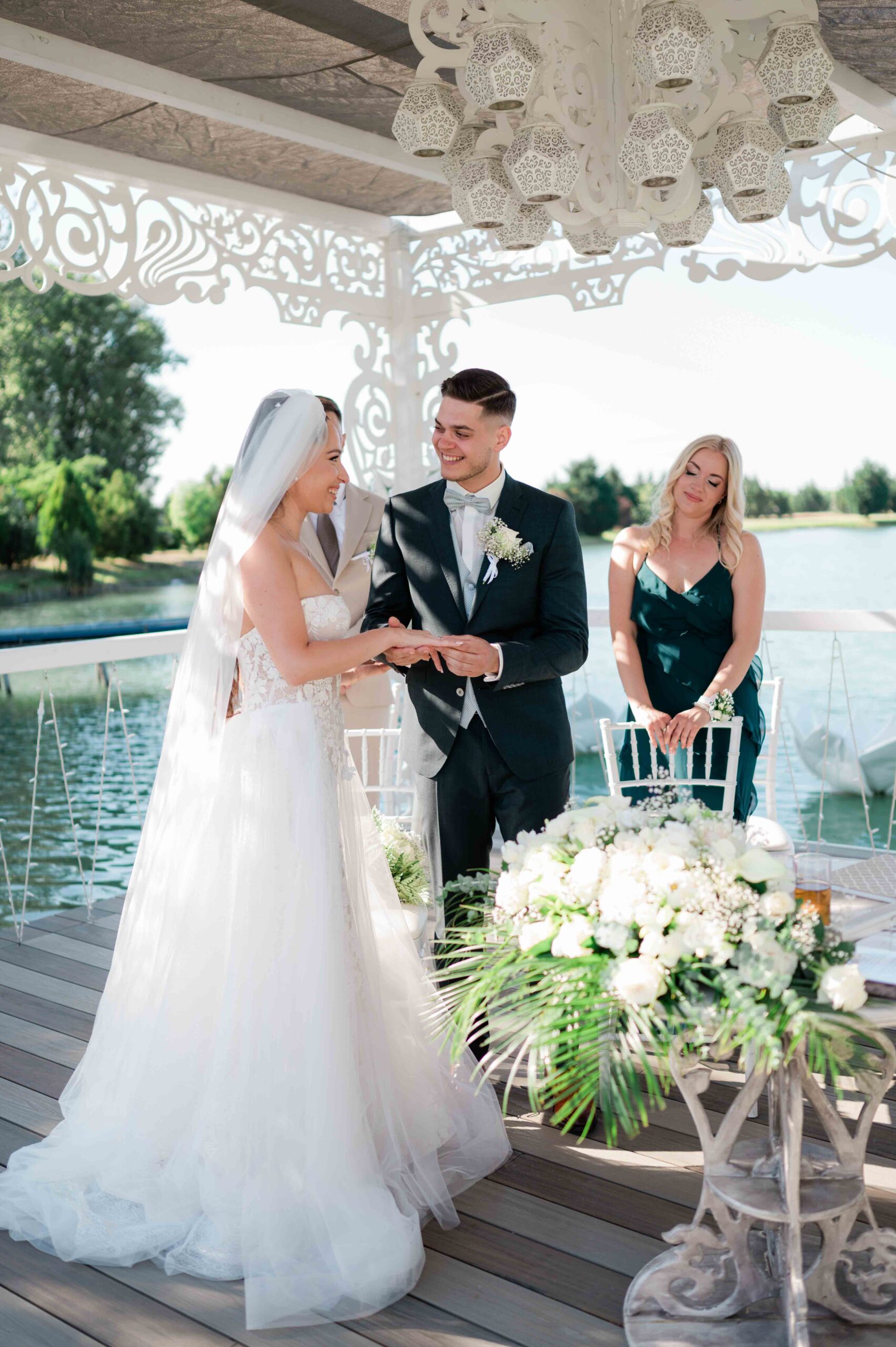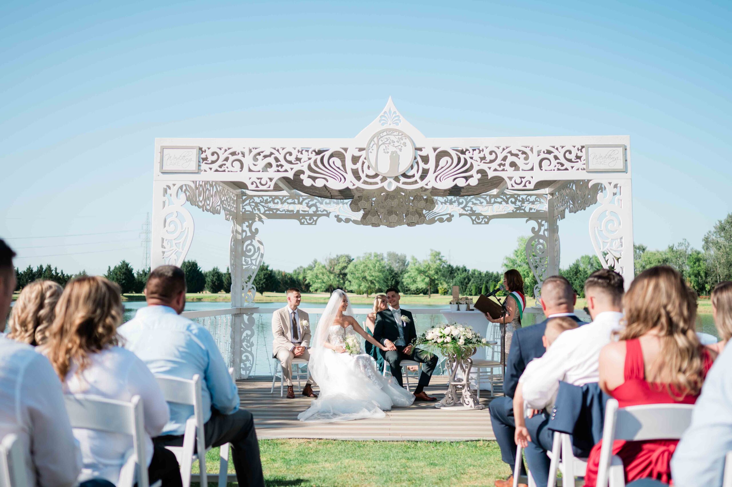 A ceremónia különleges környezetben zajlott, a Wedding Lake vízpartján. A vendégek klasszikus széksorokban helyezkedtek el, sokan közülük családtagok voltak. A szertartást végig élénk reakciók kísérték: taps, mosolyok, nevetések, amelyek jól visszaadták, mennyire közel áll egymáshoz ez a közösség.