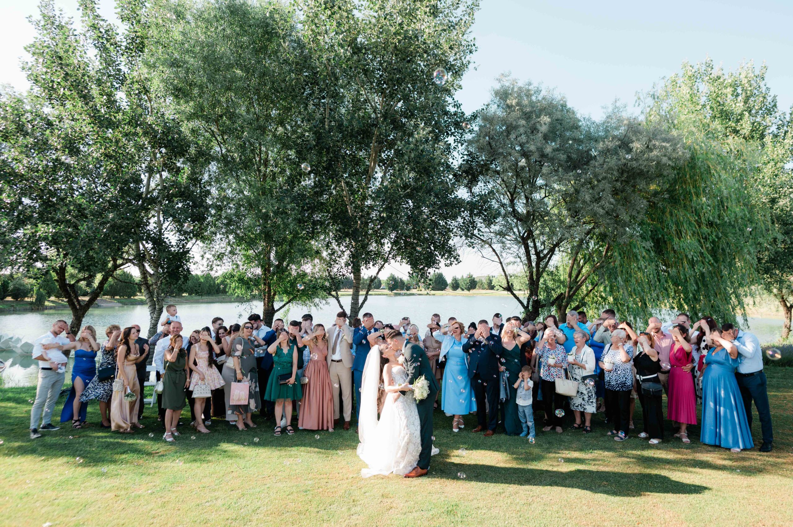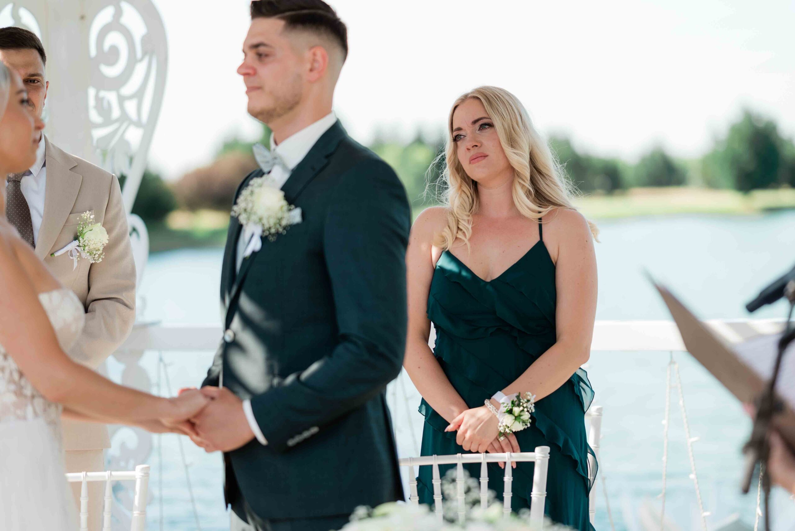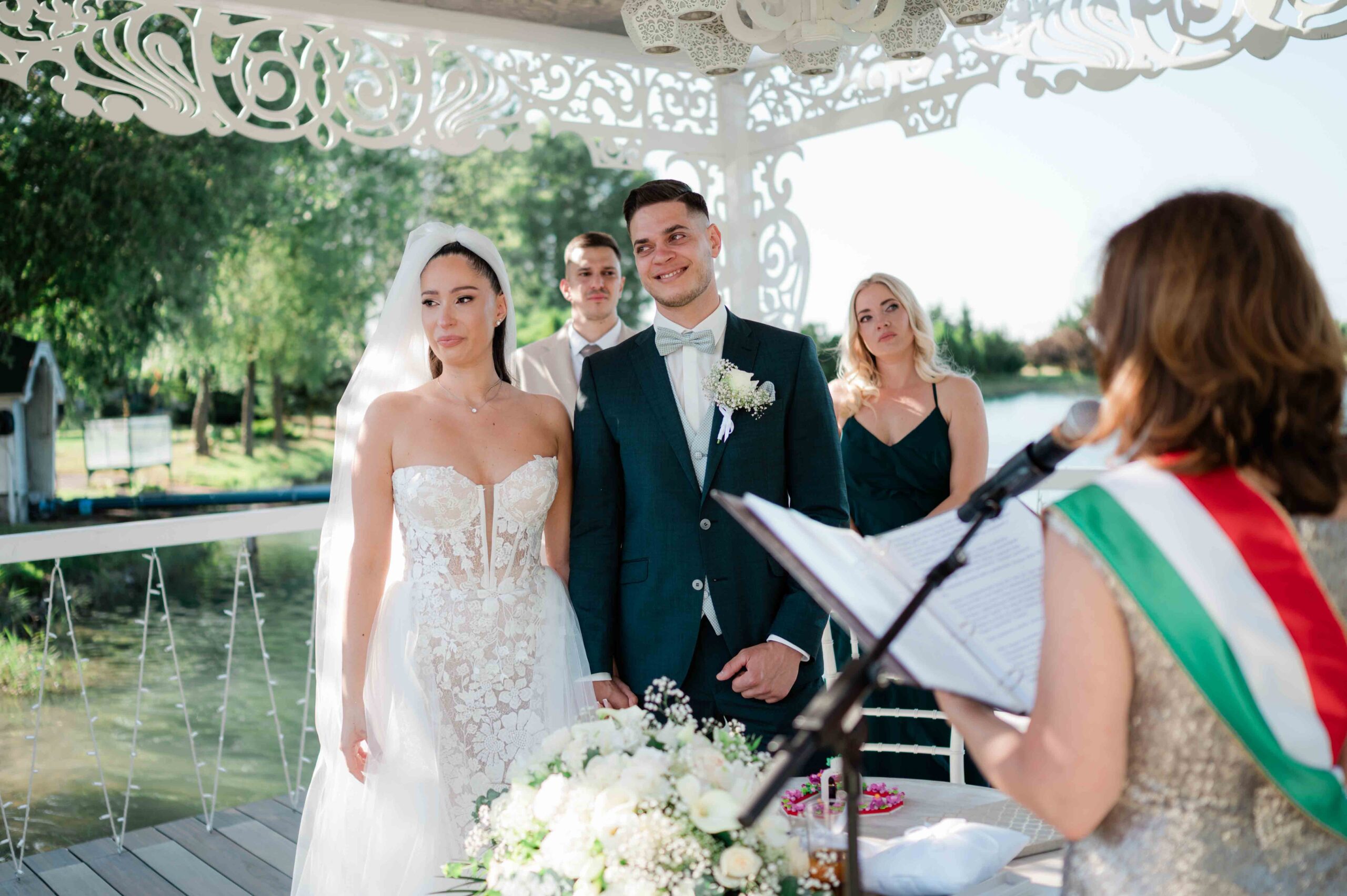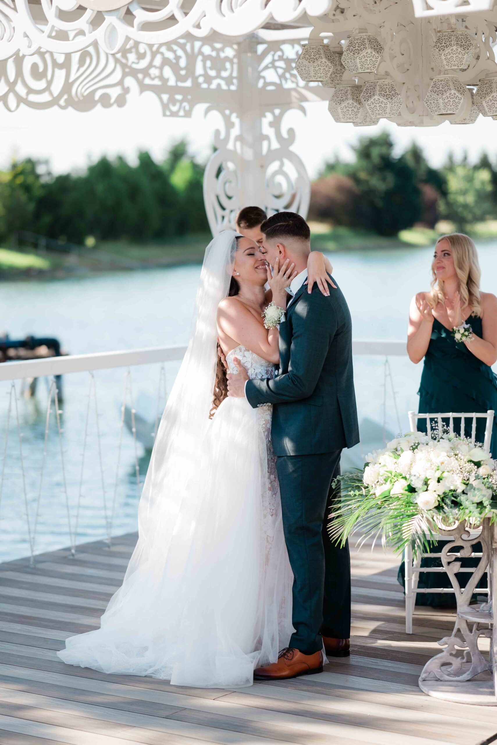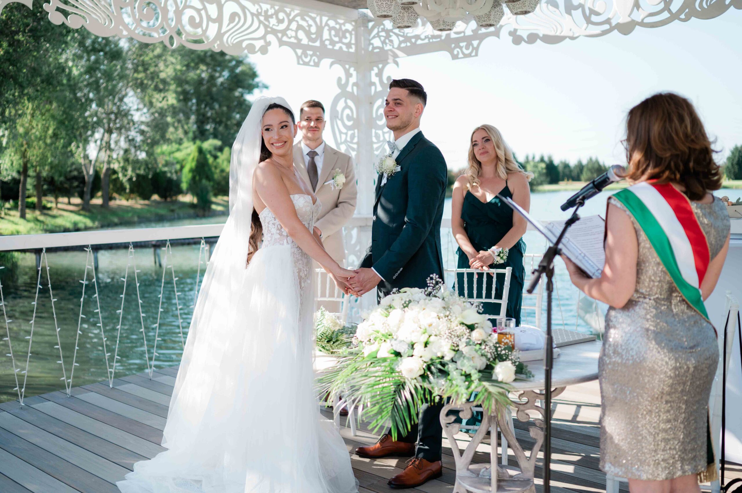 A ceremónia különleges környezetben zajlott, a Wedding Lake vízpartján. A vendégek klasszikus széksorokban helyezkedtek el, sokan közülük családtagok voltak. A szertartást végig élénk reakciók kísérték: taps, mosolyok, nevetések, amelyek jól visszaadták, mennyire közel áll egymáshoz ez a közösség.