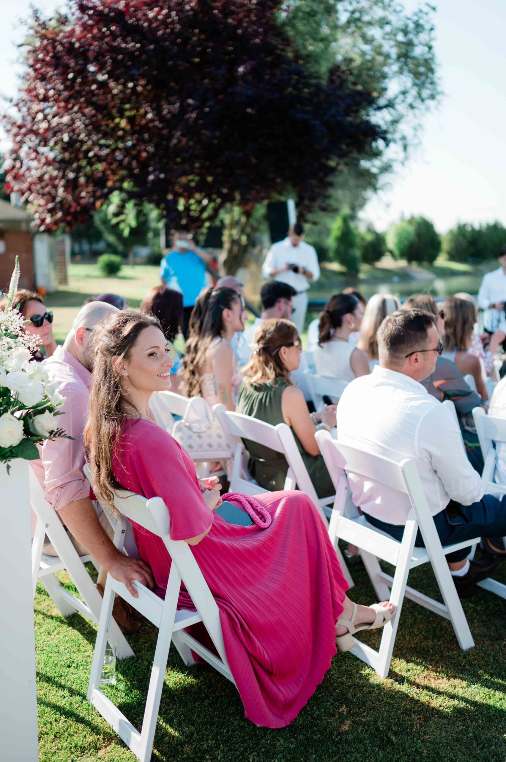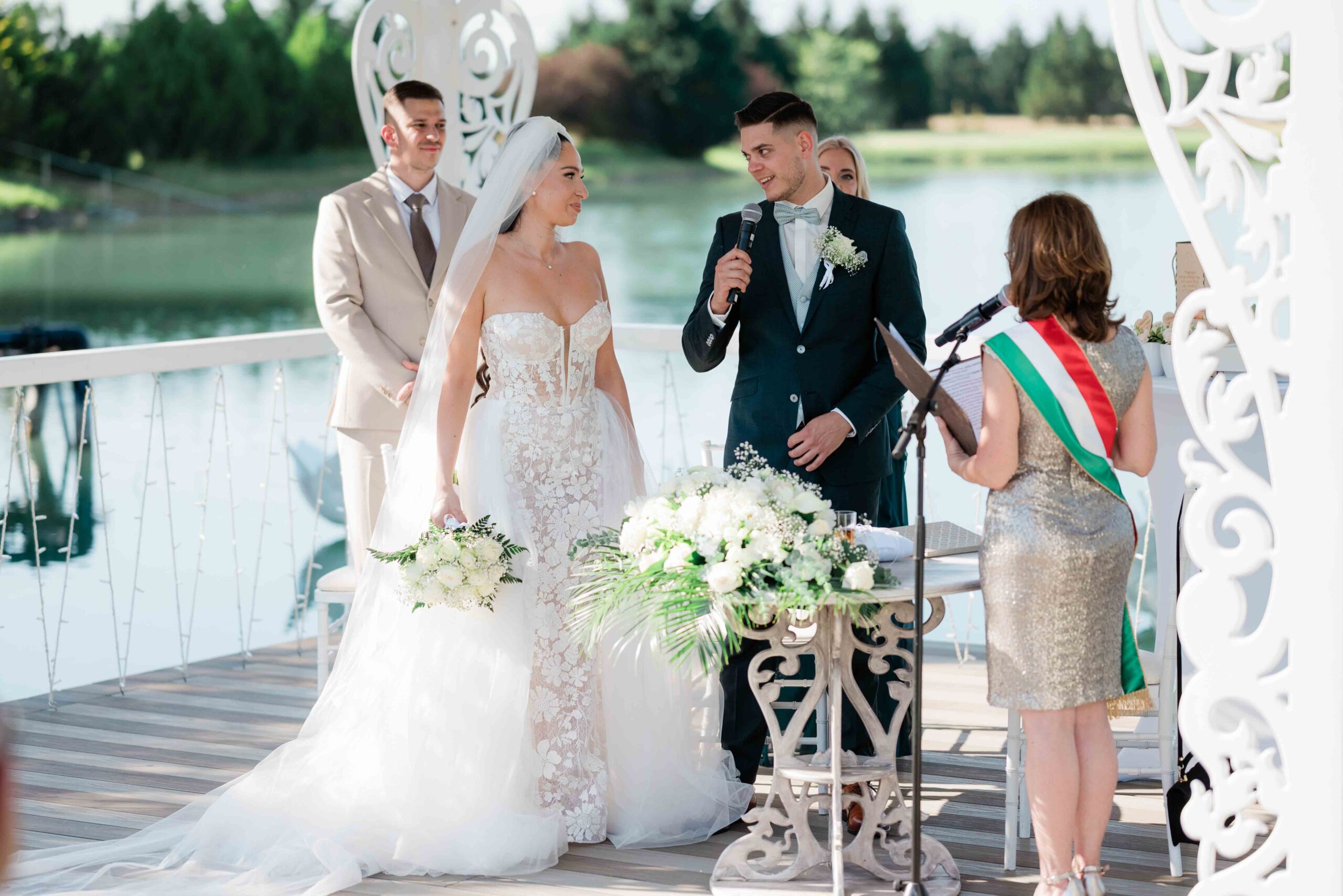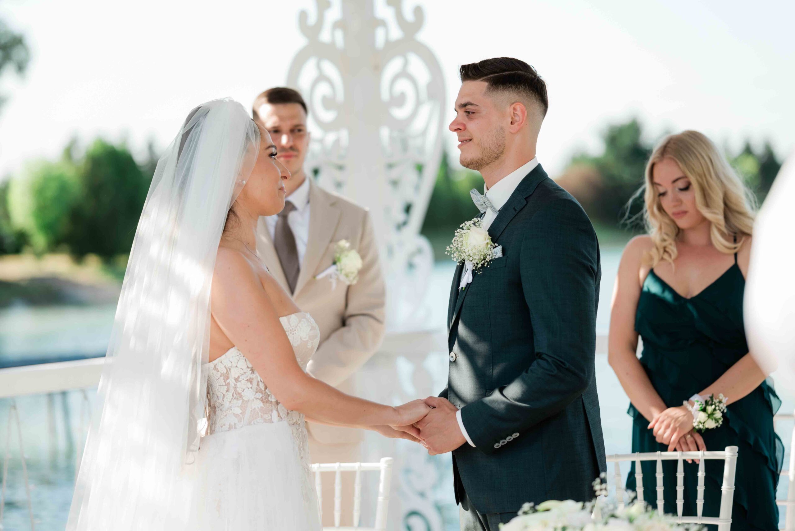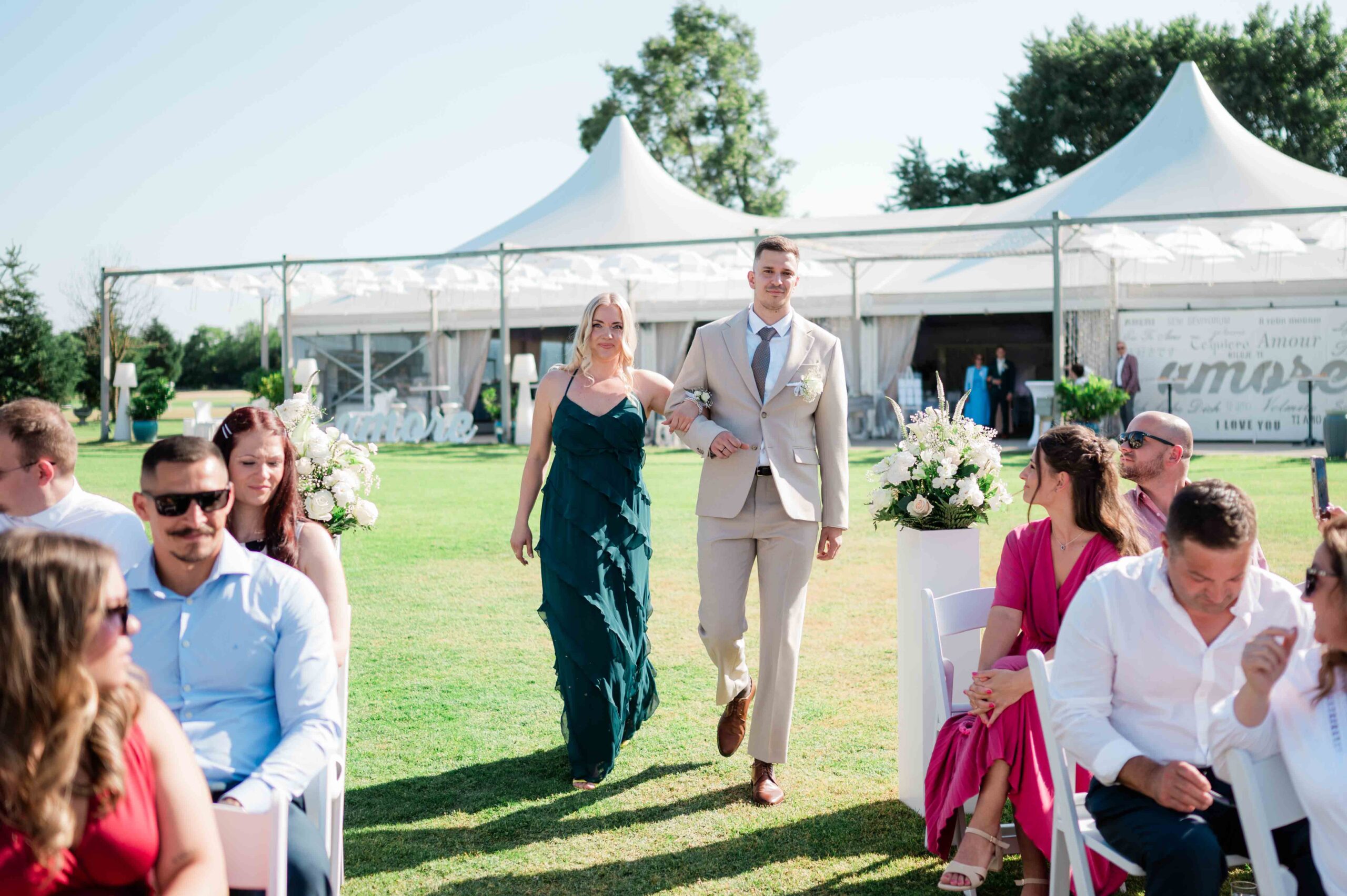 A ceremónia különleges környezetben zajlott, a Wedding Lake vízpartján. A vendégek klasszikus széksorokban helyezkedtek el, sokan közülük családtagok voltak. A szertartást végig élénk reakciók kísérték: taps, mosolyok, nevetések, amelyek jól visszaadták, mennyire közel áll egymáshoz ez a közösség.